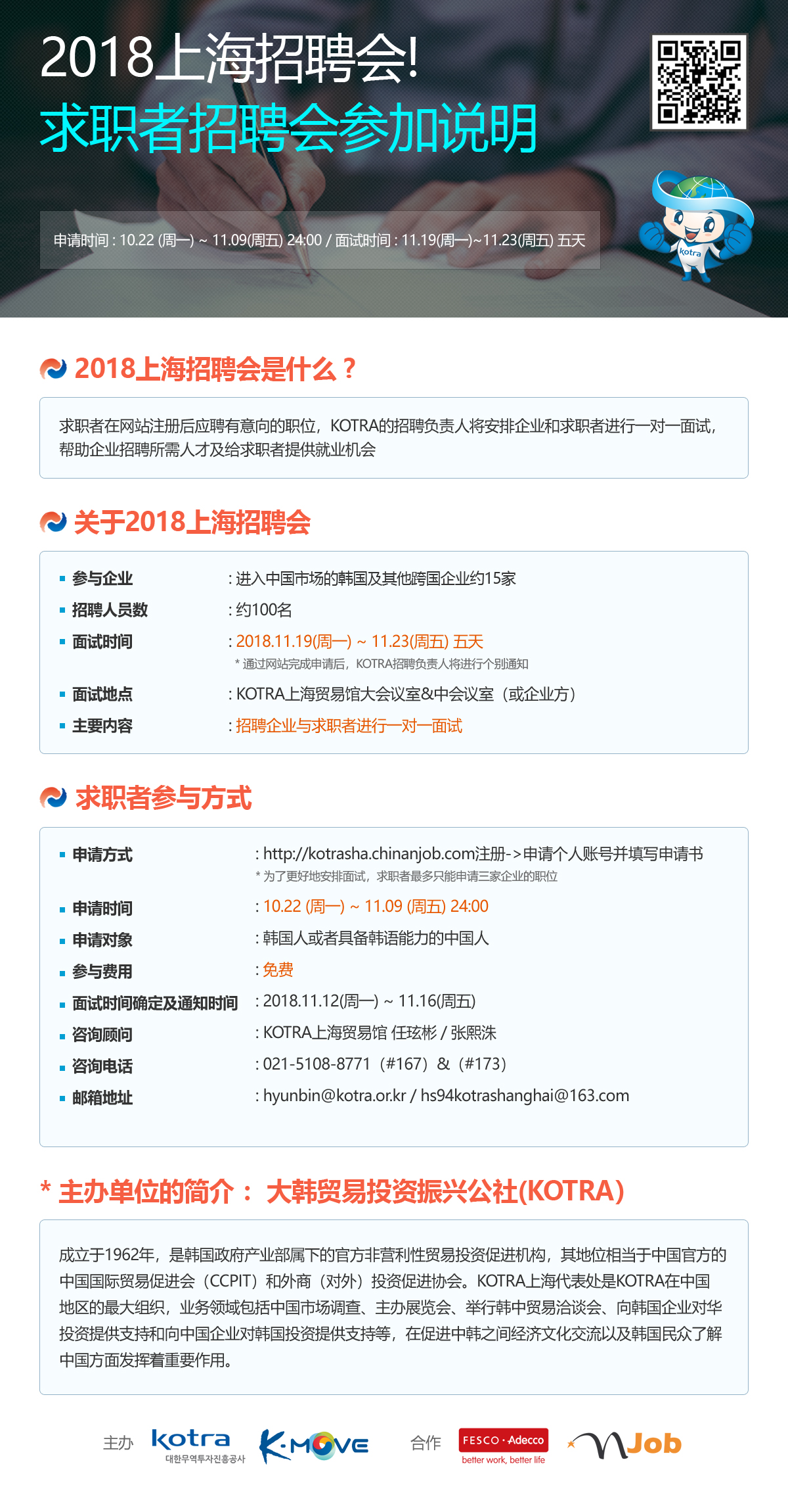 由韩国大韩贸易投资振兴公社上海代表处(KOTRA)在2018/11/19-23(五天)将主办“2018年上海招聘会“。