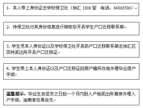 从即日起至2015年6月24日前,学生可带上本人身份证去徐汇校区保卫处(地址:徐汇区中山西路2271号1006室)开具户口迁移联系单,并持身份证与联系单去徐汇区田林派出所(地址:徐汇区柳州路56号)办理户口迁移相关手续,保卫处郑重承诺,若手续齐全,户口迁出手续当日即可完成。